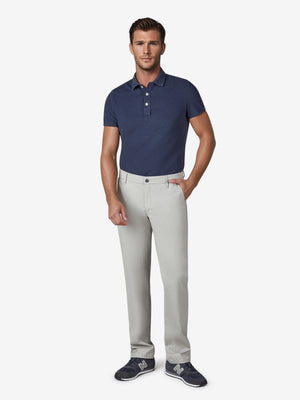 Bequeme Flat Front-Hose mit elastischem Komfortbund und Hemdstopper. Der Clou: In der rechten Vordertasche ist eine separate "Mobile Pocket" eingearbeitet, in der man sein Smartphone kratzsicher und schnell griffbereit unterbringen kann. Gefertigt aus einer ultraleichten, hochelastischen High Stretch-Baumwolle in schöner Double Dye-Färbung. Gewicht: 255 g/lfm Das Modell bietet eine normale Leibhöhe und wegen der schmaleren Fußweite einen schlankeren Beinverlauf