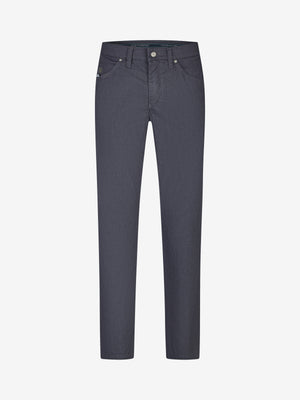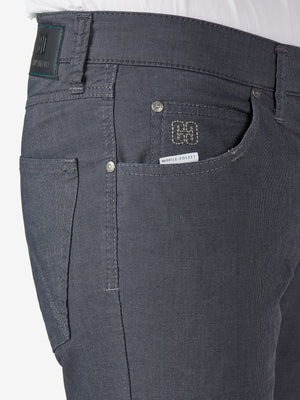 Bequeme 6-Pocket mit elastischem Doppelstoffbund und Hemdstopper. Der Clou: In der rechten Vordertasche ist eine separate "Mobile Pocket" eingearbeitet, in der man sein Smartphone kratzsicher und schnell griffbereit unterbringen kann. Die Münztasche mit Kontrast-Patch bringt einen Hauch Sportivität in den Look. Gefertigt aus einer Baumwoll-Mikrostruktur in Woll-Optik. Dieser Wool-Look bricht gekonnt mit klassischen Dresscodes. Gewicht: 300 g/lfm Dieses Modell verfügt über eine normale Leibhöhe und ein schlankes Bein bei schmaler Fußweite